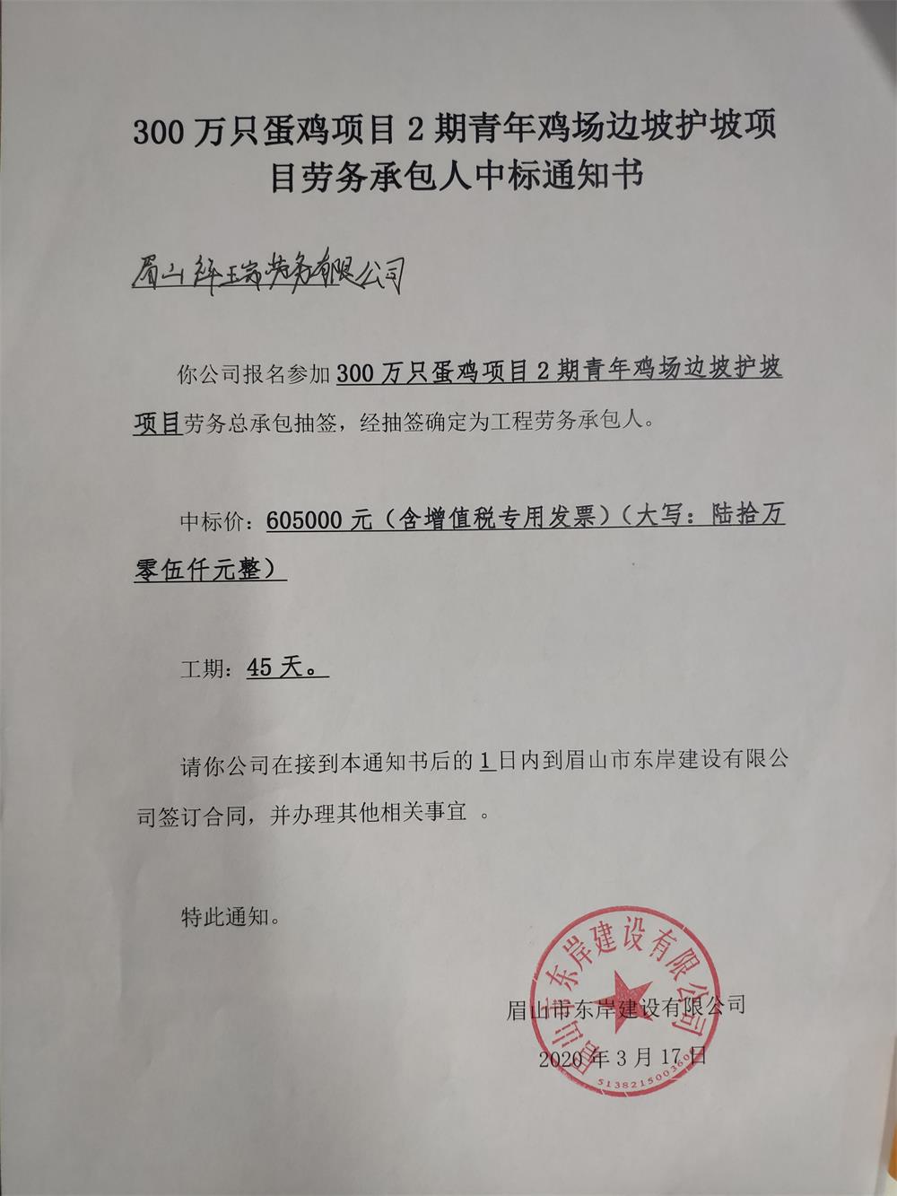 300萬(wàn)只蛋雞項(xiàng)目2期青年雞場(chǎng)邊坡護(hù)坡項(xiàng)目中標(biāo)通知
