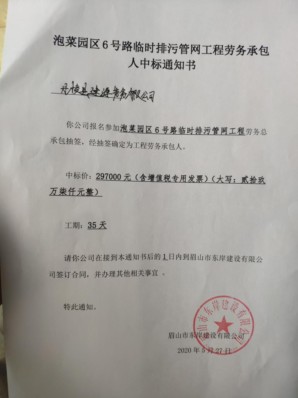 泡菜園區(qū)6號路臨時(shí)排污管網(wǎng)工程中標(biāo)通知