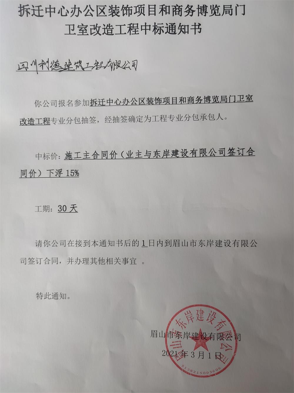拆遷辦辦公室、商務(wù)局門(mén)衛(wèi)改造、洞子口中標(biāo)通知